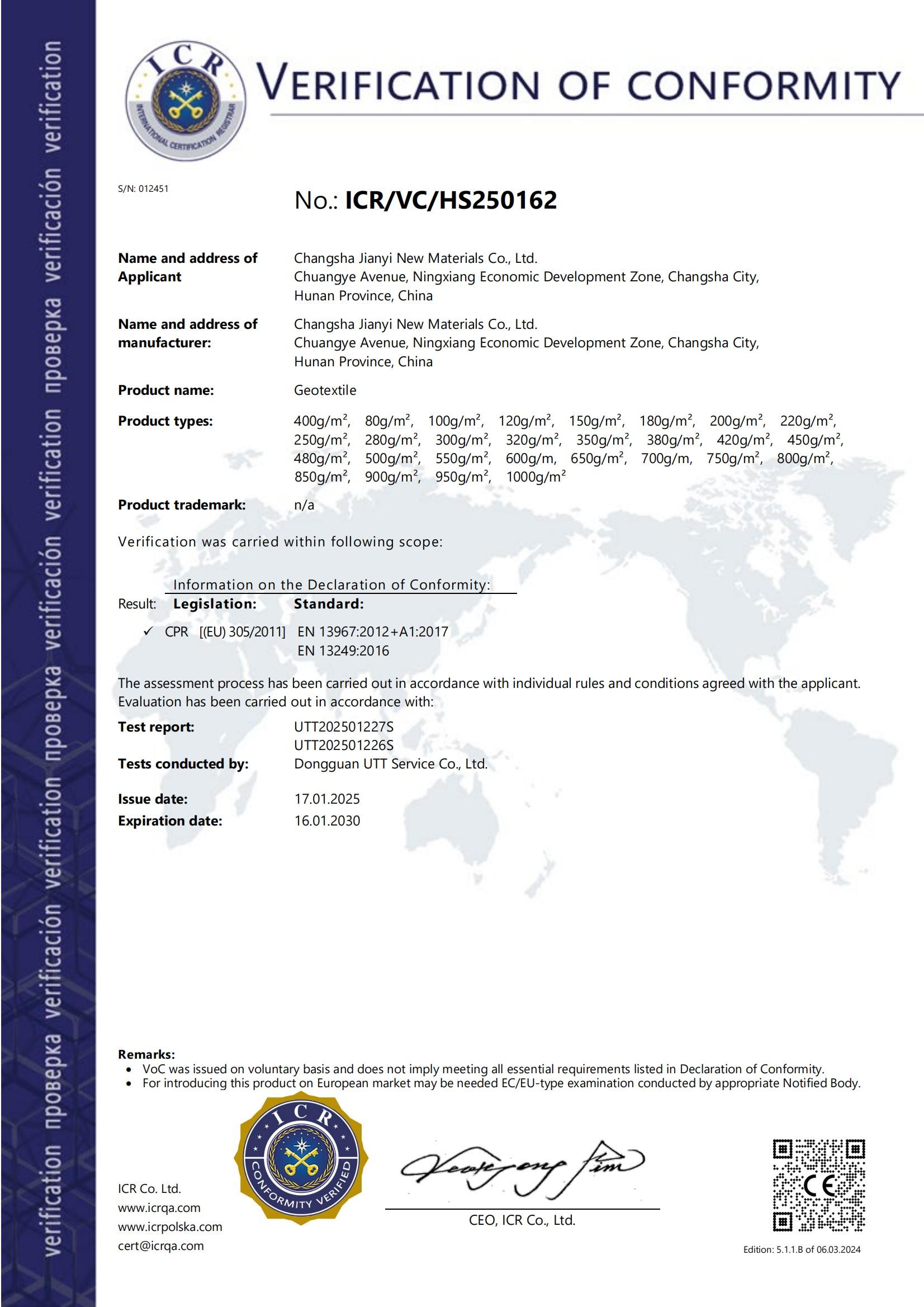Jianyi is the largest manufacturer of Long firber geotextile in Hunan,we are one of the member units of HNWPA.